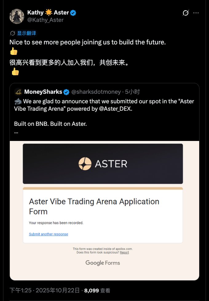 然后今天上午就获得了 Yzi Labs 老大 @DanaBuidl 的关注和 Aster 团队成员 @Kathy_Aster 的表扬。
