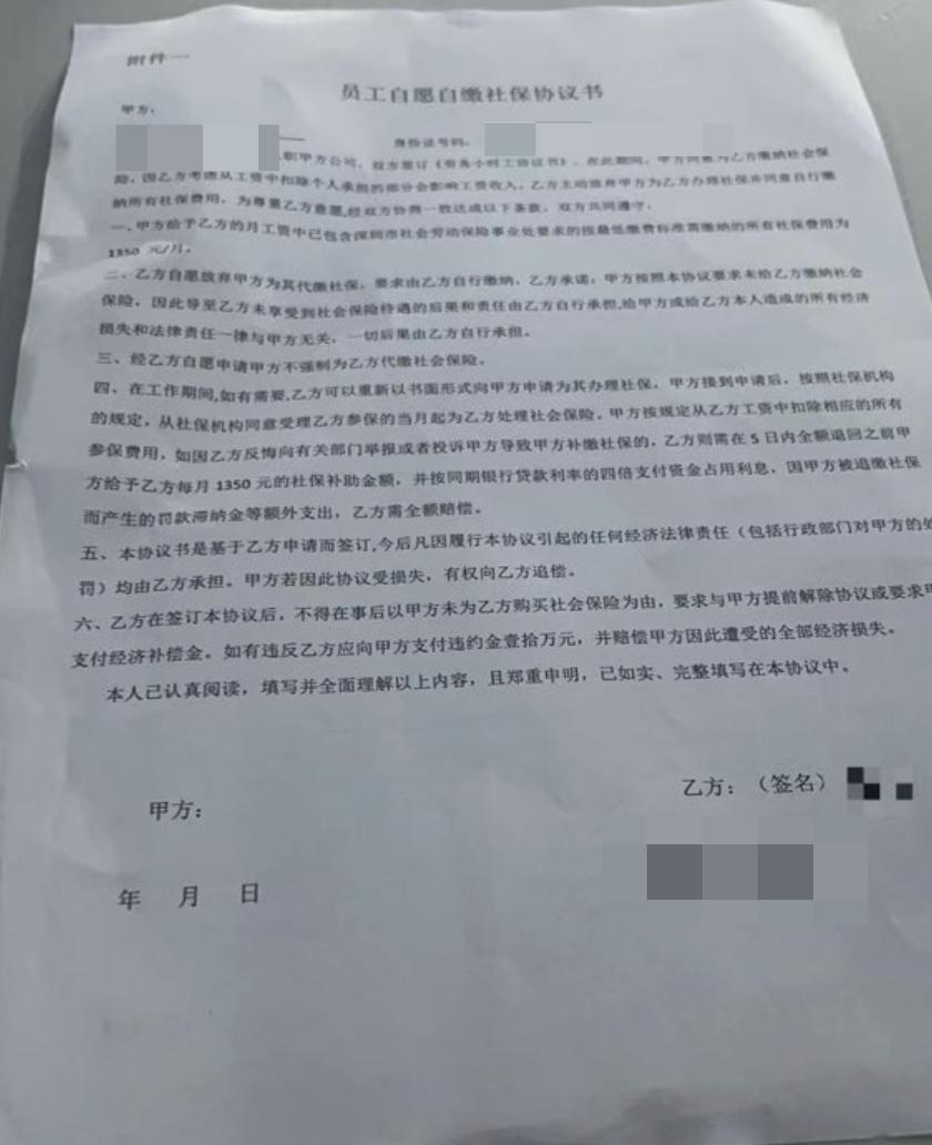 网友投稿惠州市光宏科技股份有限公司要求新入职员工签署一份协议,要求“自愿放弃缴纳社保”。