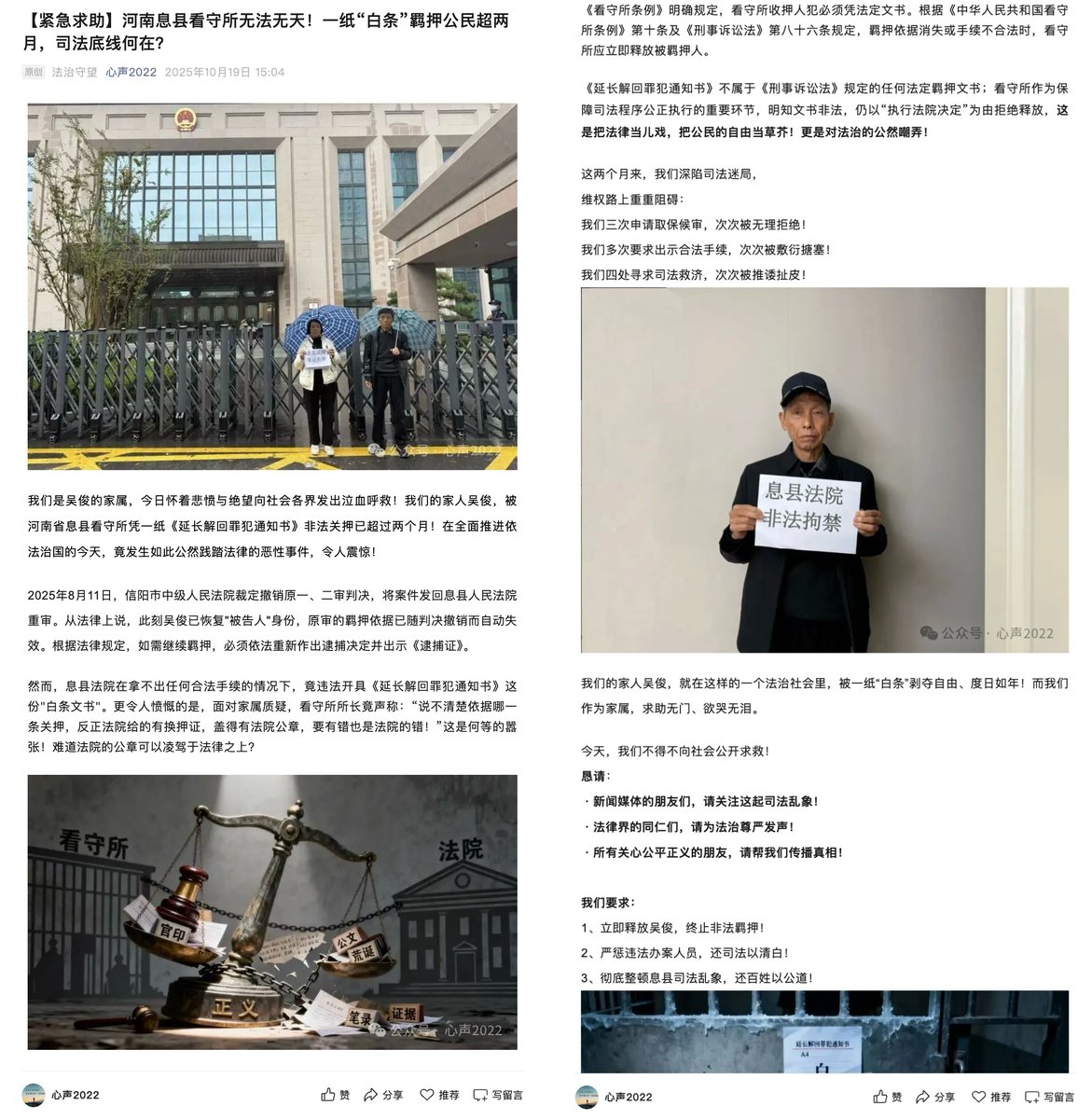 家属称,他们多次前往息县法院和看守所要求出示合法手续,却遭到推诿搪塞。看守所工作人员 reportedly 回应称“法院盖章我们就执行”,并以“程序问题”拒绝放人。吴俊家属指出,该行为违反《看守所条例》第十条及《刑事诉讼法》第八十六条的明确规定,属于非法羁押。