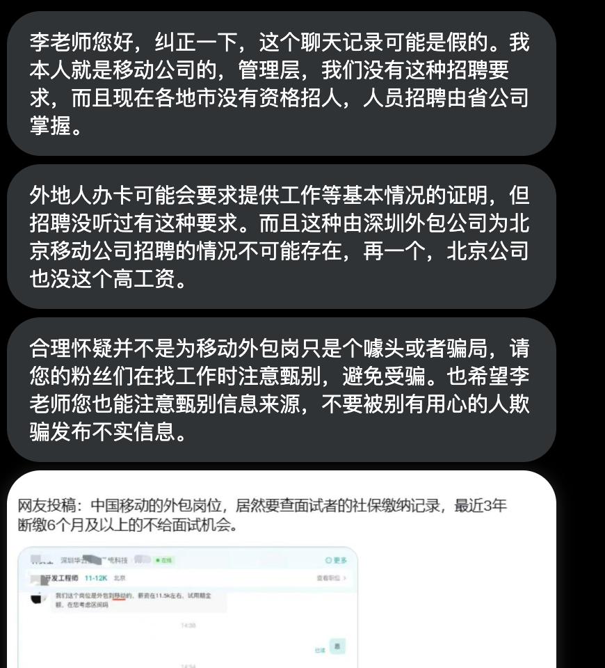 后续:针对该说法,有自称中国移动公司管理层的员工的网友表示,这一聊天记录“极可能是假的”。目前中国移动及各地分公司均无相关招聘计划,也没有权限招人,人员招聘统一由省公司掌握。