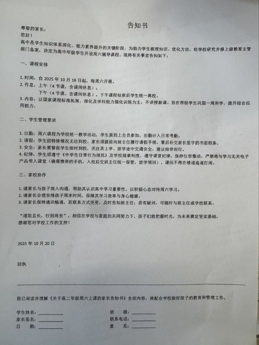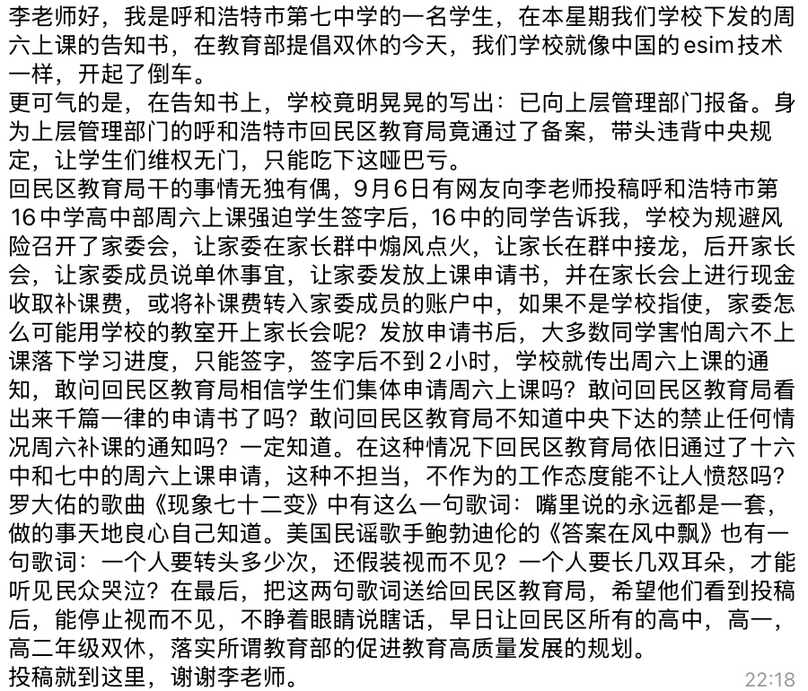 https://t.co/nOCeks6y5H 呼和浩特市第七中学近日通知学生周六上课,并声称已向上级报备。投稿人质疑,教育部已明确要求落实双休,但回民区教育局仍批准学校单休,明显违反政策。 第16中学也存在类似情况,学校通过家委会组织家长“自愿”签字同意周六上课,并收取补课费。多数学生担心落下进度,只能被迫签字。 投稿人呼吁回民区教育局停止推诿,严格落实教育部“双休”政策,让学生恢复正常休息。