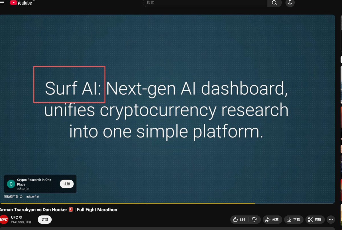 在油管上正在看UFC比赛录像,突然插入一个广告,习惯性关闭之前突然感觉有点眼熟 😂😂看来最近他们应该收益不错,广告都精准打到油管炒币群体了,哪怕不是在看炒币内容。Surf目前在我身边的研究员朋友圈子里口碑依然还是很不错的,我也依然是每天都会使用。