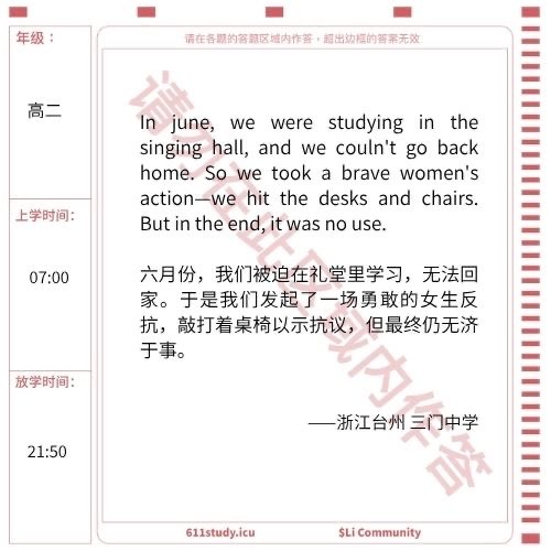 六月份,我们被迫在礼堂里学习,无法回家。于是我们发起了一场勇敢的女生反抗,敲打着桌椅以示抗议,但最终仍无济于事。