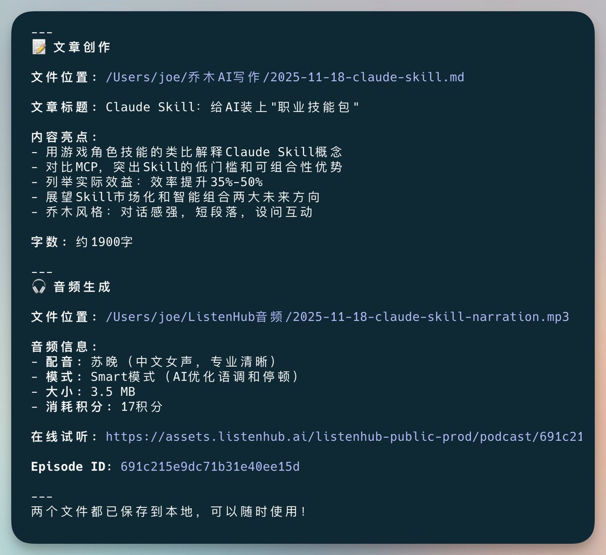 生成文章后,让 家的Listenhub念出来。