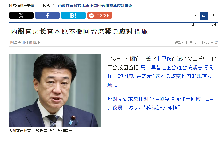 11月18日,据日本时事通信社报导,日本官房长官木原稔18日再度重申,首相高市早苗不会撤回台湾有事相关发言,并强调其言论并不会改变日本政府以往的立场。