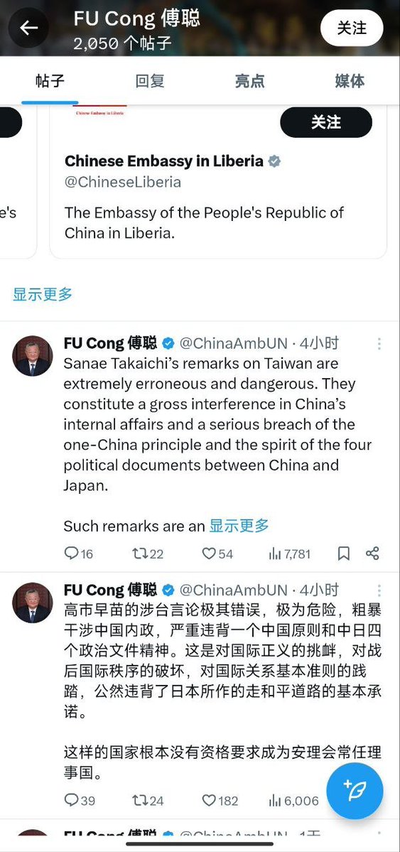11月19日,中国常驻联合国代表、特命全权大使傅聪,连发多条推文强烈批评日本首相高市早苗的涉台言论,指其说法极其错误、危险,严重干涉中国内政,违反一个中国原则和中日四个政治文件精神,破坏国际秩序与国际正义。他警告称,若日本胆敢以武力介入台海,将构成侵略行为,中国必将迎头痛击,并依据《