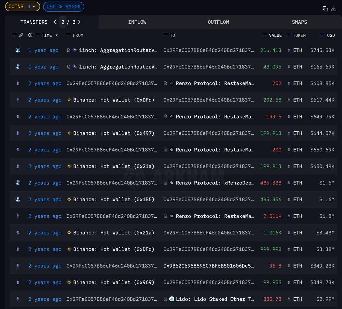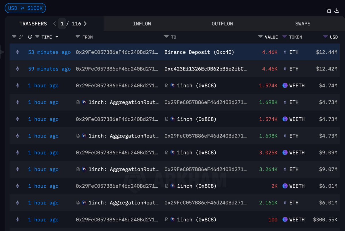 持仓 $ETH 近两年,从浮盈 1640 万美元拿到亏损,这位朋友似乎终于要清仓了🫠地址 0x29F...335EF 过去 1 小时向 #Binance 充值 8920 枚 ETH(约 2485 万美元),这些 $ETH 是 2024.03-2025.02 期间以均价 $3024 从交易所提出的,本次若卖出将亏损 212 万美元…此次充值后他的钱包仅剩 0.04238