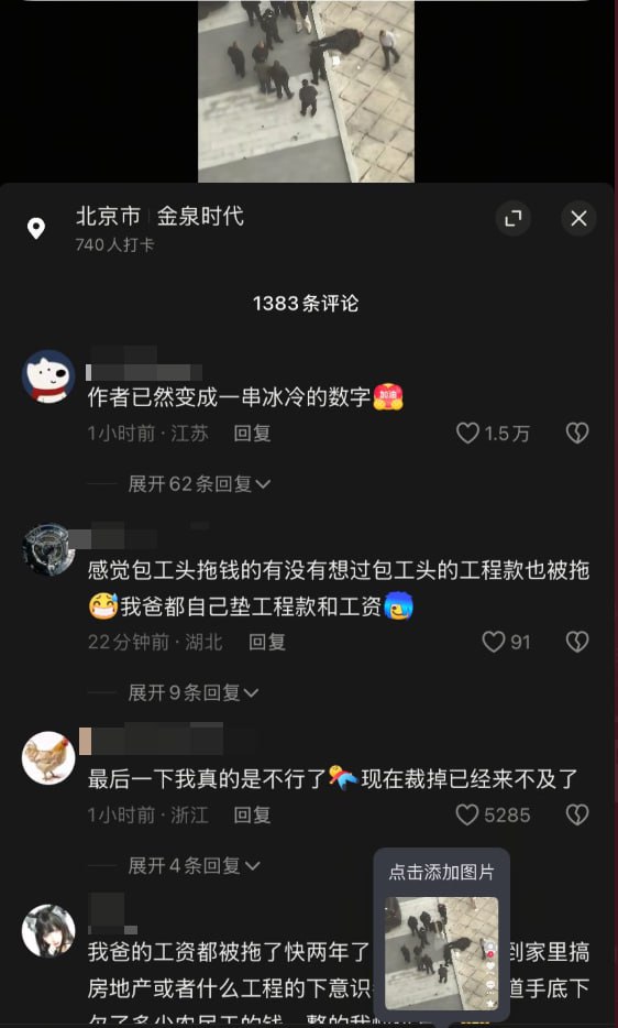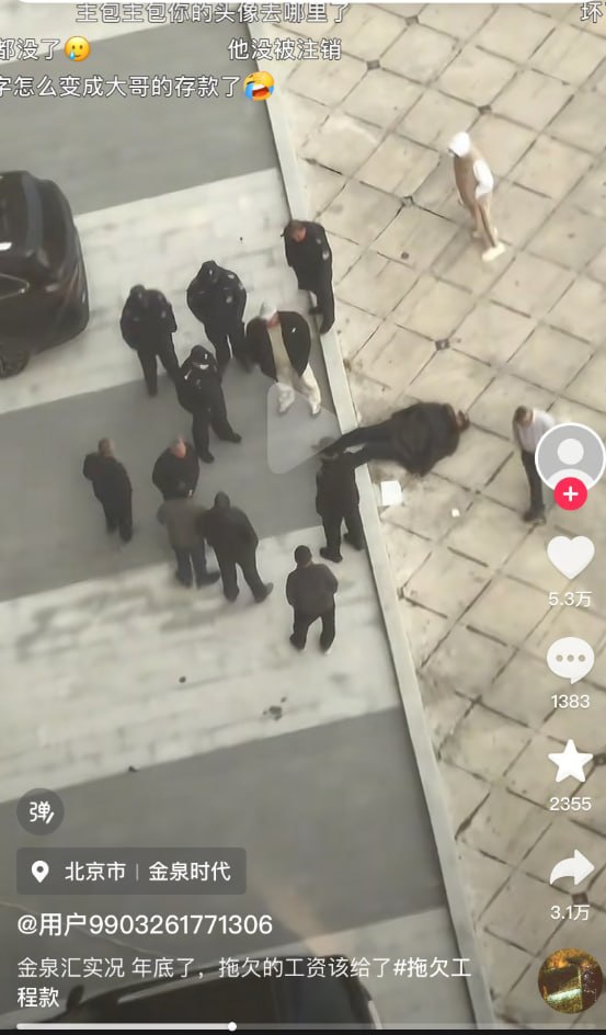 近日,北京市朝阳区金泉汇附近,一名网友拍到 一名工友在年底讨薪未果后选择跳楼轻生。目前视频已经被平台删除。