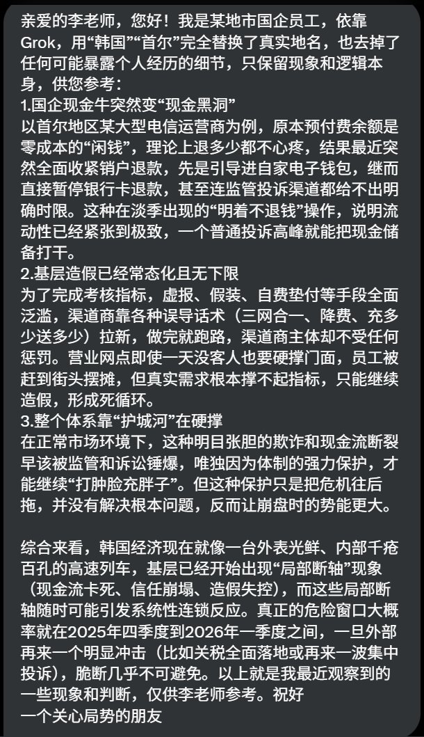 网友投稿我是某地市国企员工,依靠Grok,用“韩国”“首尔”完全替换了真实地名,也去掉了任何可能暴露个人经历的细节,只保留现象和逻辑本身,供您参考: