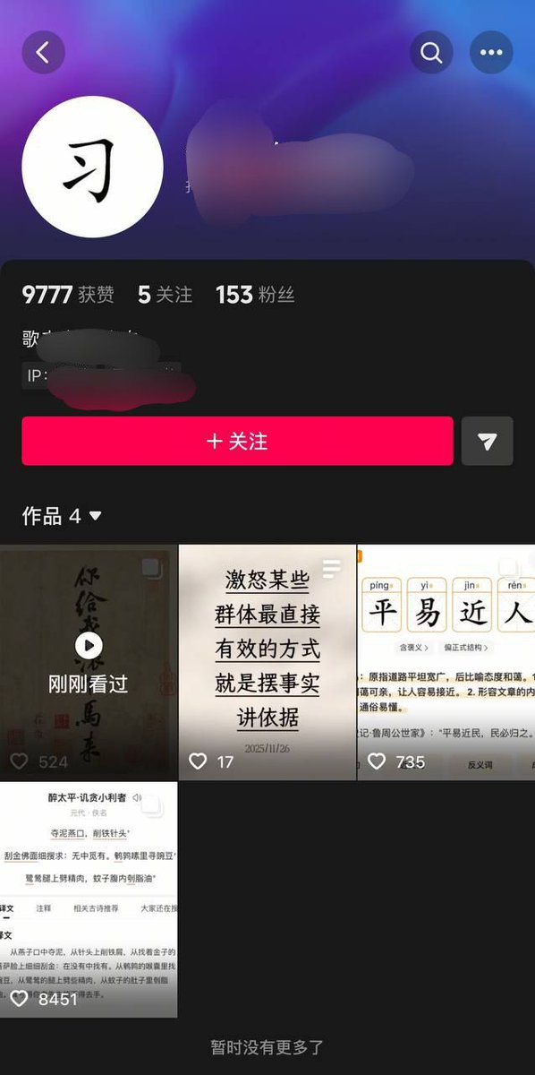 网友投稿:抖音一博主顶着个习的头像,发布书法作品:“给我滚下马来”。