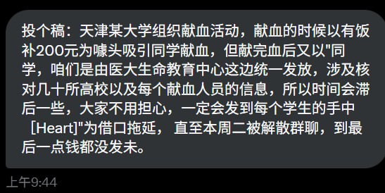 网友投稿近日,天津某高校,学校曾组织献血活动,并以“献血补贴 200 元饭补”为宣传噱头吸引同学参与。然而献血结束后,补贴却迟迟未到账。