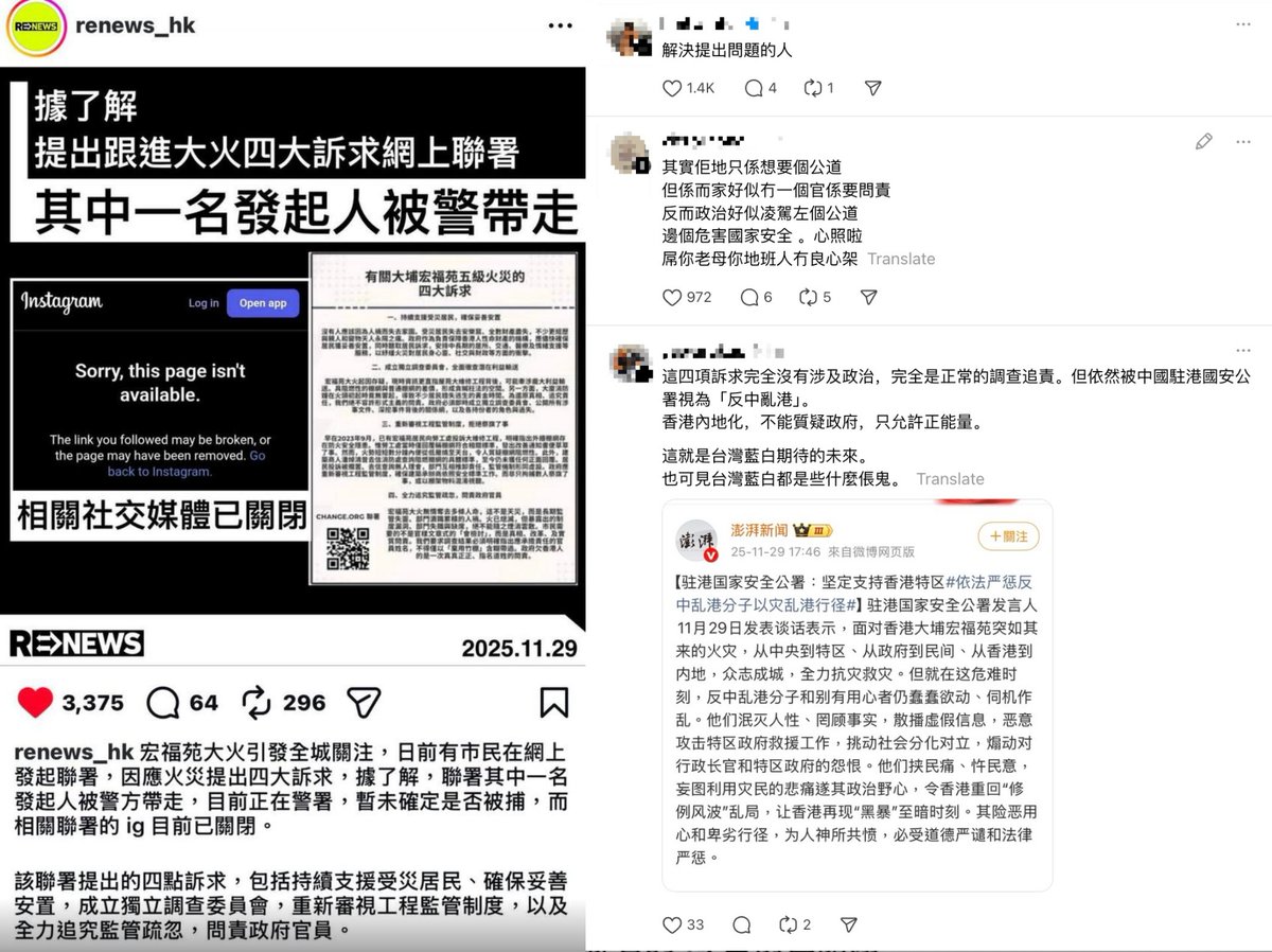 香港加速内地化,宏福苑大火后:四项民间诉求被视为“反中乱港”宏福苑大火引发全城关注,近日有市民在网上发起联署,就火灾提出四大诉求。据了解,联署的其中一名发起人已被警方带走,目前在警署内,尚未确认是否被正式拘捕,而相关联署的 IG 账号也已关闭。