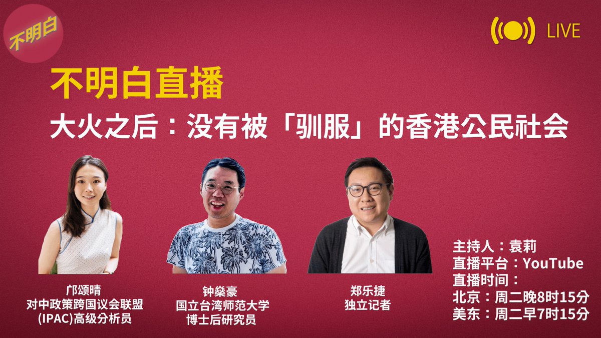 北京时间周二晚上8时15分,不明白播客邀请到三位香港嘉宾进行直播,他们分别是 邝颂晴、 钟燊豪与 郑乐捷。我们将一起讨论香港大火之后的舆论战、香港公民社会动员,以及国安法下的香港正在经历怎样的变化?欢迎大家提问: