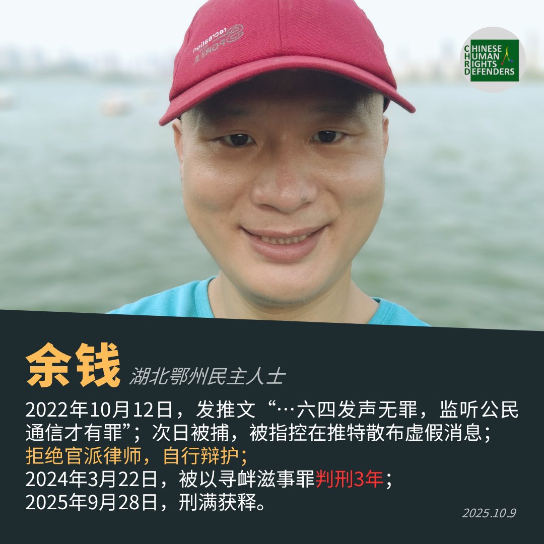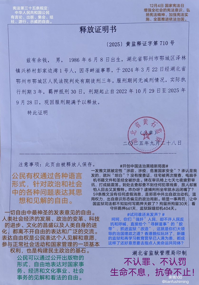“不认罪、不认罚。生命不息,抗争不止!” 湖北鄂州公民 #余钱 披露自己因 59 条推文被控“涉政、涉疫、危及国家安全”,曾被铐在审讯椅上七天七夜疲劳审讯,打成脑震荡,在拘留所30天,看守所661天,监狱踩缝纫机404天。#试问谁还未发声