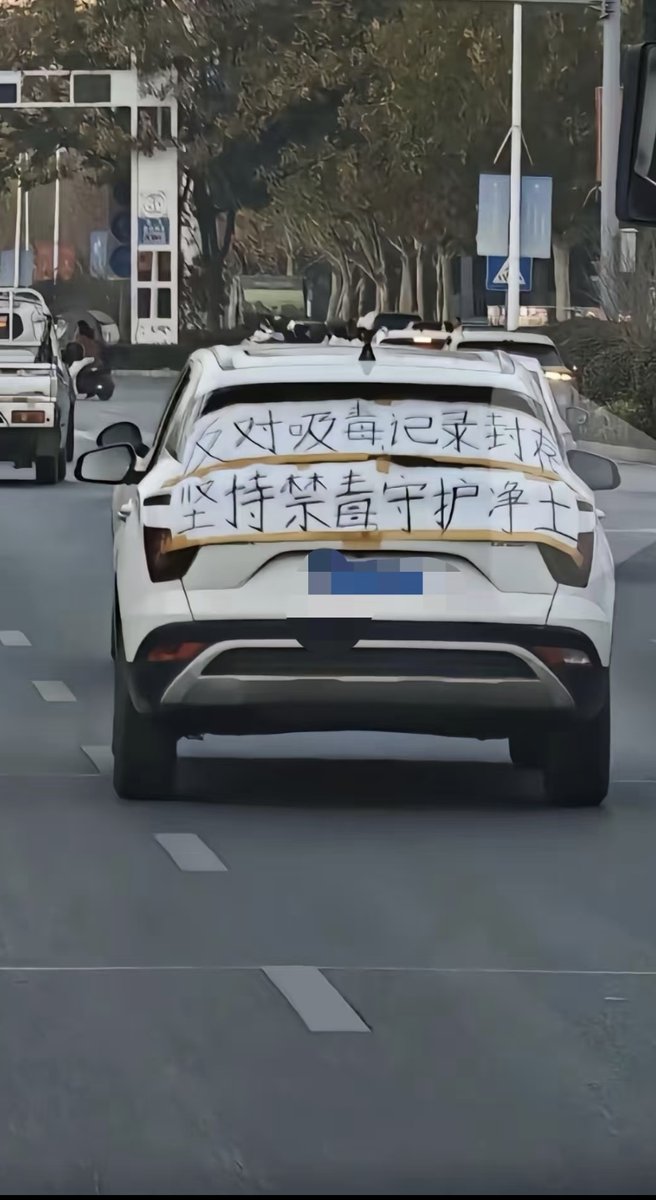 12月2日,有网友拍摄到一辆车后挂着横幅“反对吸毒记录封存,坚持禁毒守护净土”。