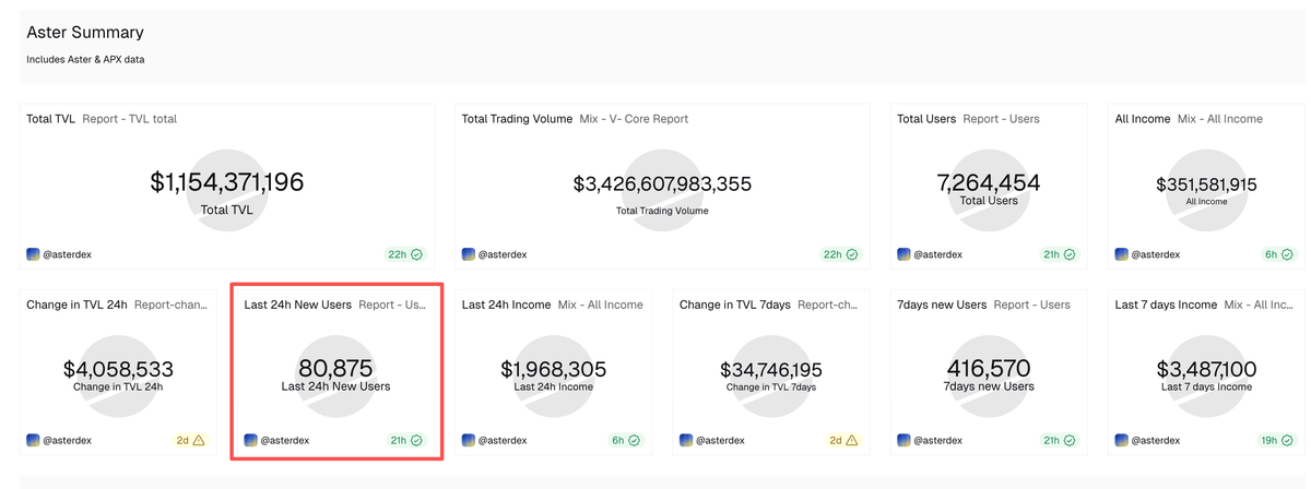 热知识:通过第三方数据平台检索数据时,需要交叉验证例如看到 Aster 日活用户数 116 这个离谱的数字时,可以通过 Defilama / Dune / 项目方官网再次确认下,就会发现总用户量应为 7.28M,日均为 80K 左右 👉如果只有 116 个活人的话,Aster 第四期积分计划的用户就能人均