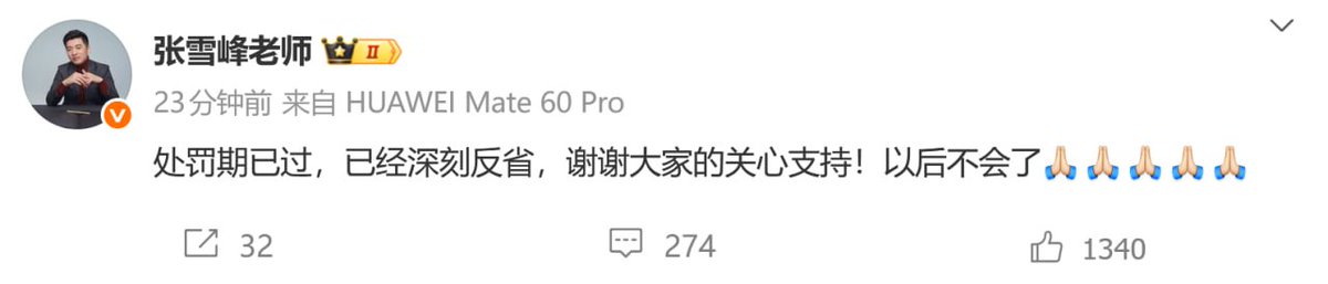 12月3日,张雪峰在微博发文回应说,“处罚期已过,已经深刻反省,谢谢大家的关心支持!以后不会了。”