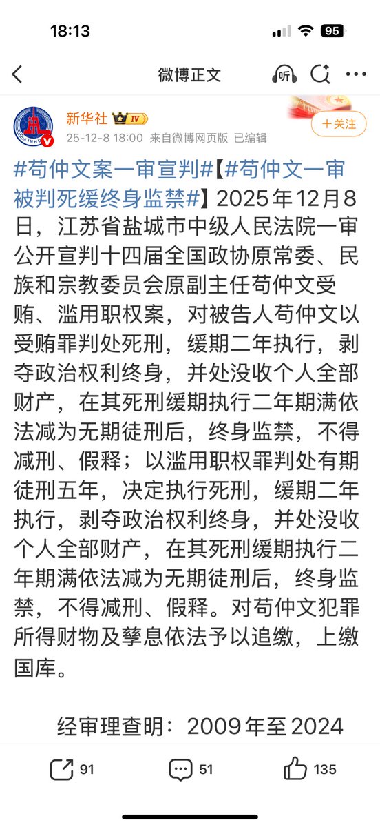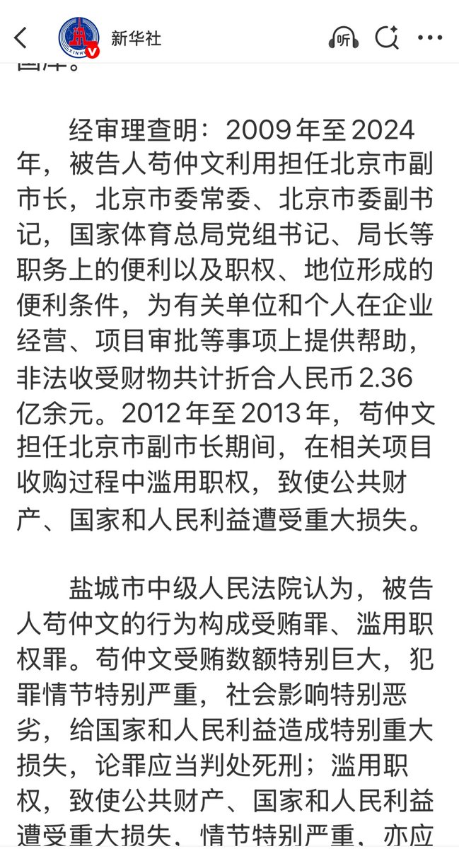 新华社报道:原国家体育总局局长苟仲文一审被判死缓终身监禁。