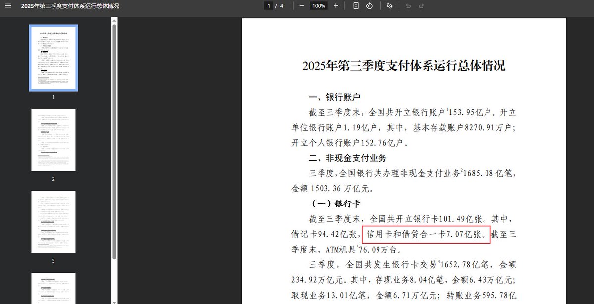 近日,据央行披露的《2025年第三季度支付体系运行总体情况》显示,2025年9月末,信用卡数量已减少至7.07亿张。根据此前数据对比,信用卡数量已从2022年9月末8.07亿张的历史高点,连续12个季度下降,至今缩减了约1亿张卡。