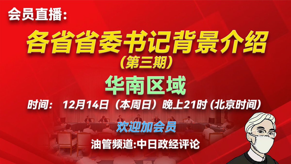 12月14日(本周日)晚上21点(北京时间),油管会员直播,主题:各省省委书记背景介绍(三)—华南区域。欢迎加入会员,不见不散!