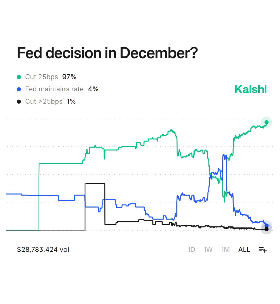 UNITED STATES: There is a 97% chance the Federal Reserve cuts interest rates by 25 bps tomorrow, according to prediction market.