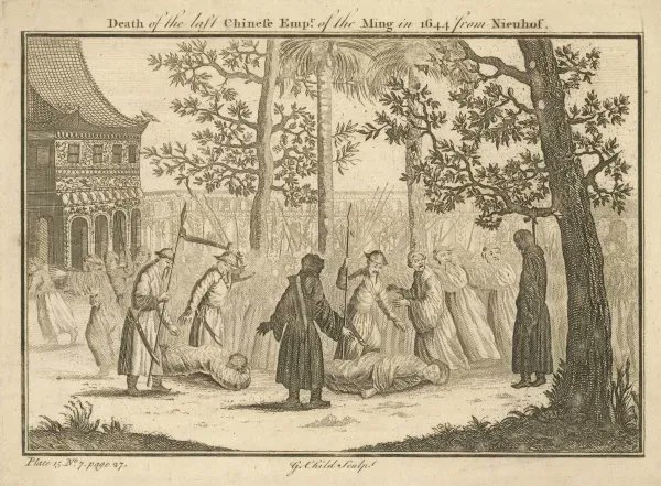 比较搞笑的是,因为清朝严苛的文化政策,欧洲人画的《崇祯帝殉国图》比中国人还多。比如图一铜版画《1644年明朝末代皇帝之死》出自18世纪荷兰著名雕刻家雅各布·范·德·斯赫雷之手,源自《环球旅行通史》系列图册,是西方对崇祯自缢的想象性描绘。图中的服饰、棕榈树和建筑都有典型的东方主义色彩。