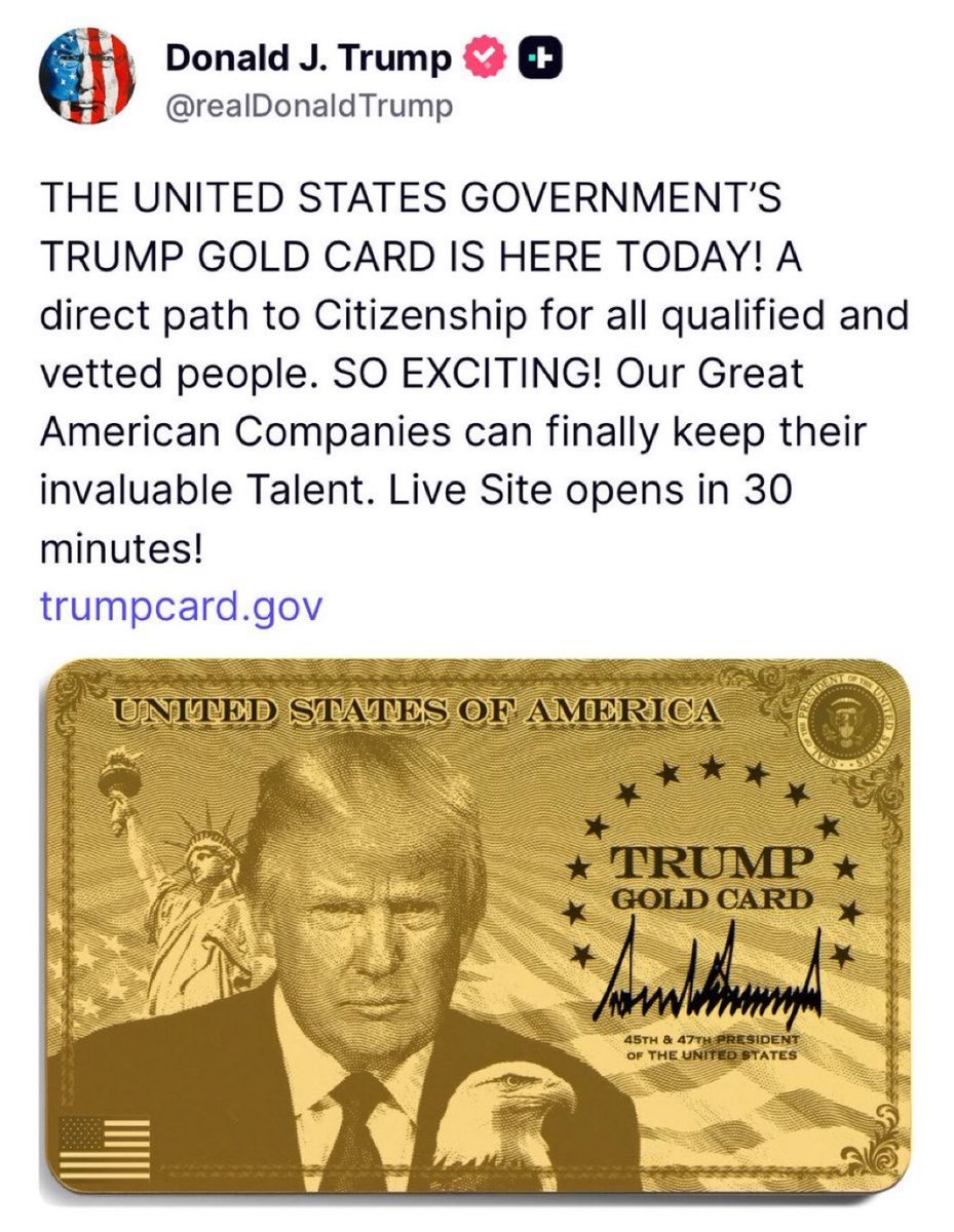 突发新闻——川普宣布“川普金卡”今日正式推出。富人可以用钱直接买国籍。