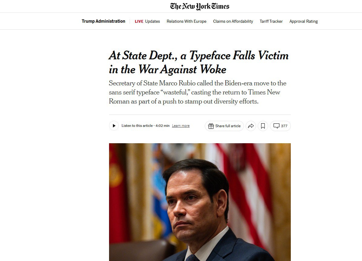 卢比奥目前在国务院的一个改革是必须放弃Calibri字体,用回Times New Roman 14号字体。