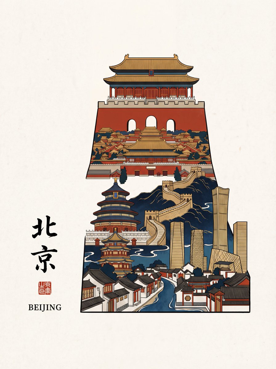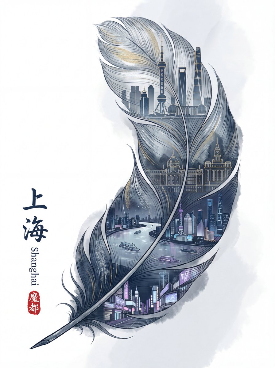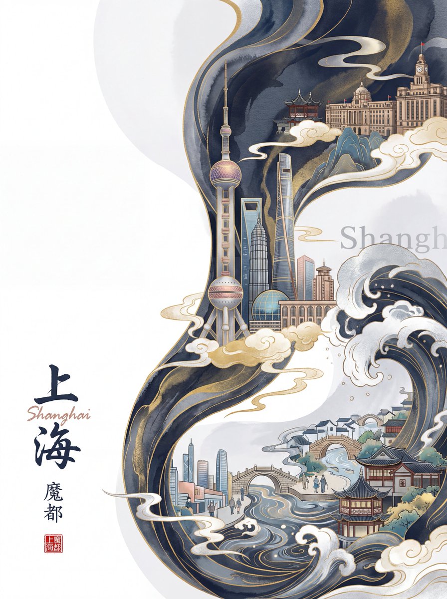 提示词:城市地标,东方明珠塔,传统建筑,国潮风格,矢量插画,流动的让水墨感,藏蓝与金色,白底,优雅构图,扁平设计,8k分辨率