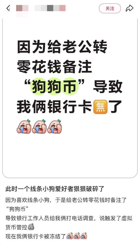 建设银行回应转账备注"狗狗币"被锁卡:若账户涉及虚拟货币交易,银行将对账户进行“不收不付”管控据中国新闻周刊报道,近日有网友因在建设银行转账时备注"狗狗币"而遭遇锁卡。当事人于女士称,几个月前她与丈夫通过建行互相转账 250