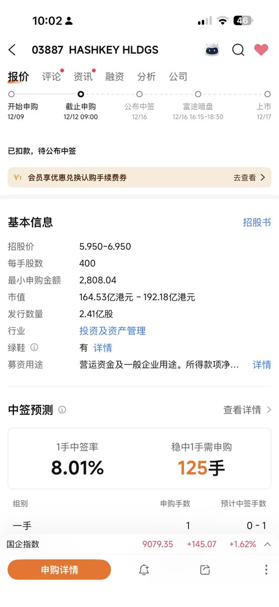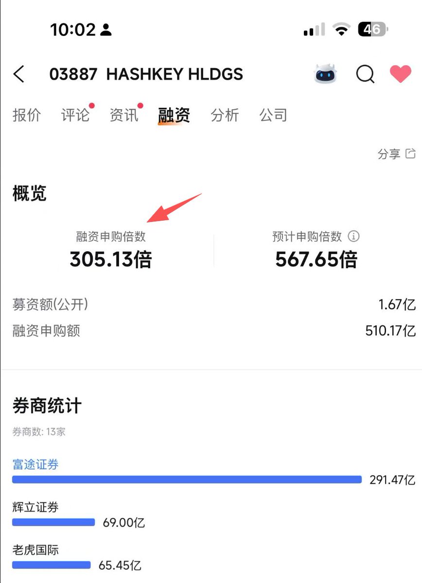 什么叫远香近臭? 上次说的HashKey 打新今天出结果了,超募305倍。币圈的人骂的狗血喷头 @HashKeyGroup ,圈外的人削尖脑袋往里挤。 想稳中需要至少申购125手,也就是投入35万港币。市场情绪82%看涨,理论上说一级没抢到的购买力会转化为二级,难不成这把要挣钱了?😂😂 币圈与股市一直存在一定的信息差和认知差,至少美股是体现的淋漓精致,这次看看港股咋样。