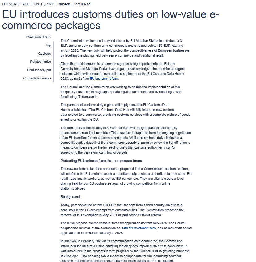 Confirmation now of a €3 customs duty to be applied to e-commerce parcels from outside the EU that are worth under €150 from July 2026No mention of China in the press release, but this is all about Temu, Shein, AliExpress. Postal services are overwhelmed by volume of packages