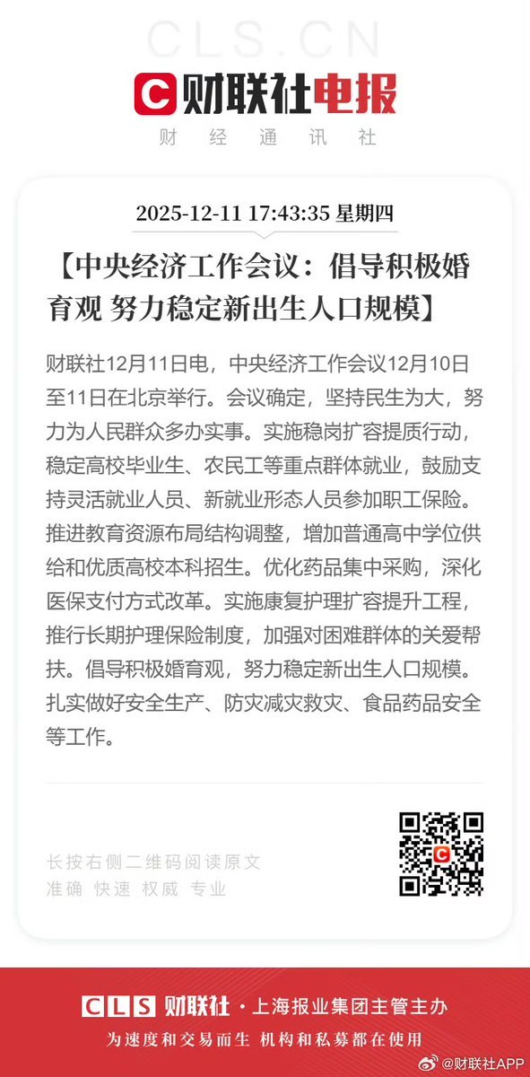 12月11日,据财联社报道,习近平在中央经济工作会议强调:倡导积极婚育观,努力稳定新出生人口规模 。