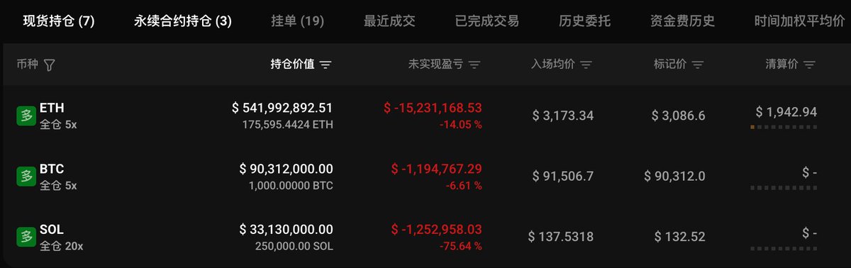 ▶︎ SOL:持仓 25 万枚(3312 万美元),开仓价 $137.53,浮亏 125.3 万美元