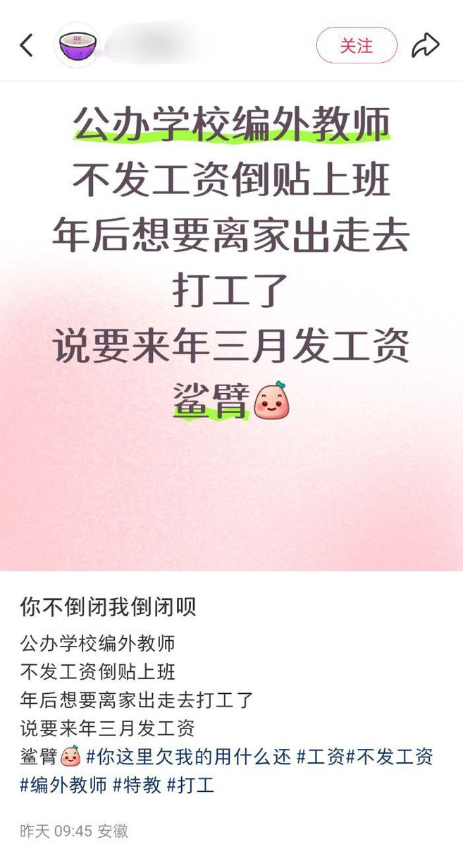 12月11日,安徽,编外教师发帖吐槽:公立学校编外教师不发工资,现在要倒贴上班,校方称工资要拖到明年三月份发。