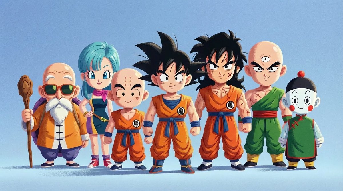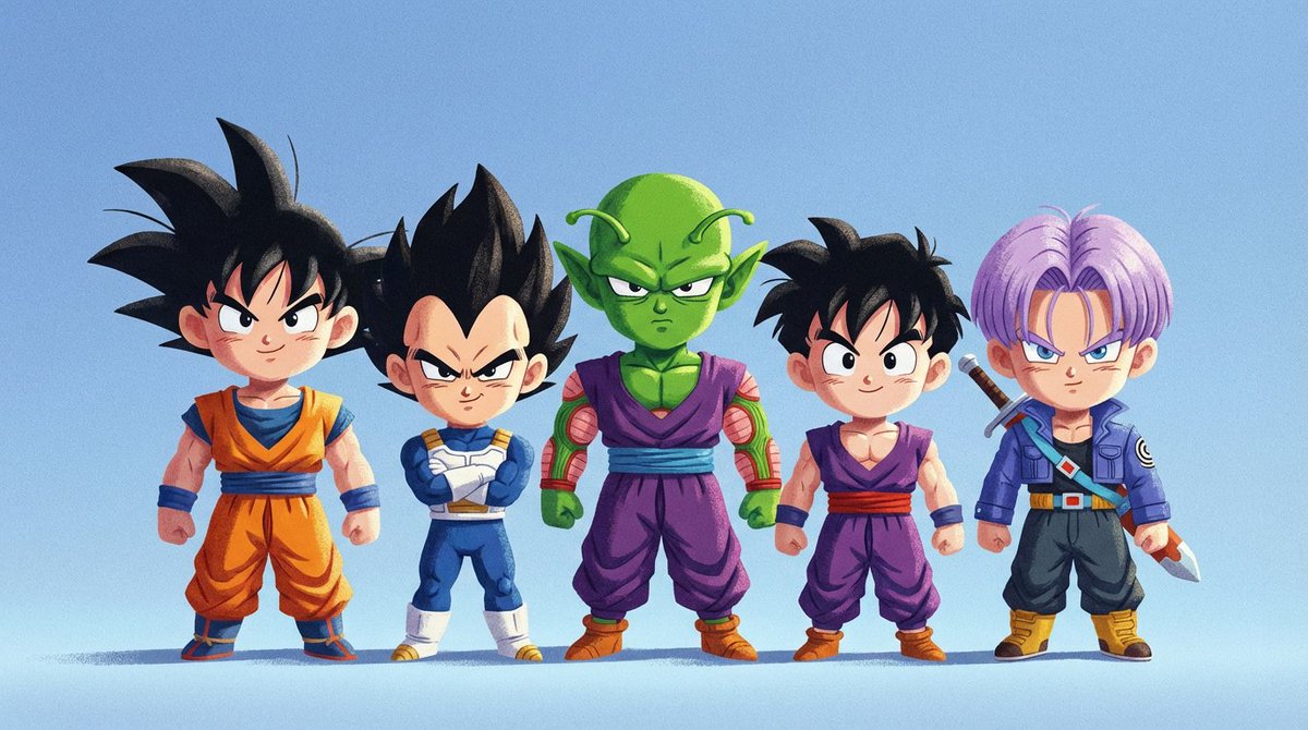 「[主题类型]」from「Dragon Ball Z」in「Q-style chibi pseudo 3D illustration style」, 「[构图方式]」, 「2.5D flat illustration style」with「enhanced dimensional depth」and「layered composition」with「subtle 3D volume effect」, 「featuring [角色详细描述]」, 「all in adorable chibi proportions」with「large head to body ratio about 2-3 heads tall」with「large expressive eyes」and「[面部风格]」, 「[站姿朝向]」, 「[排列方式]」, 「soft light blue gradient background」with「smooth seamless transition」with「subtle floor ground」with「no harsh edges」, 「consistent soft gentle side lighting」from「right to left」「maintaining fixed lighting direction」creating「subtle shadows on character(s)」, 「consistent minimal soft shadow on ground」「following the lighting direction」from「right to left」「maintaining perfect alignment with light source」, 「moderate saturation colors」with「comfortable color palette」, 「moderate contrast」, 「very heavy prominent grain texture overlay」on character body and clothing, 「extra strong noise and paper texture effect」, 「grainy illustration aesthetic」not CGI render, 「textured painted look」with「highly enhanced visible granular surface」, 「artistic hand-drawn feel」with depth, 「16:9 aspect ratio」
