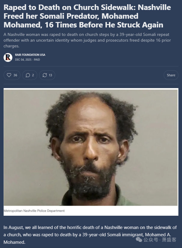 💥教堂台阶上遭强奸致死 - 此前纳什维尔警方曾16次释放其索马里施暴者!
