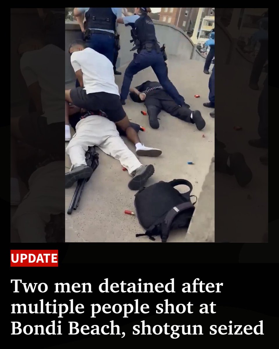 #UPDATE: Two men have been detained after multiple people were shot at Bondi Beach. A shotgun and several shell casings were found on a nearby footbridge where police made the arrests. It comes as a woman who was in t nearby when the gunfire began claims she heard more than 50