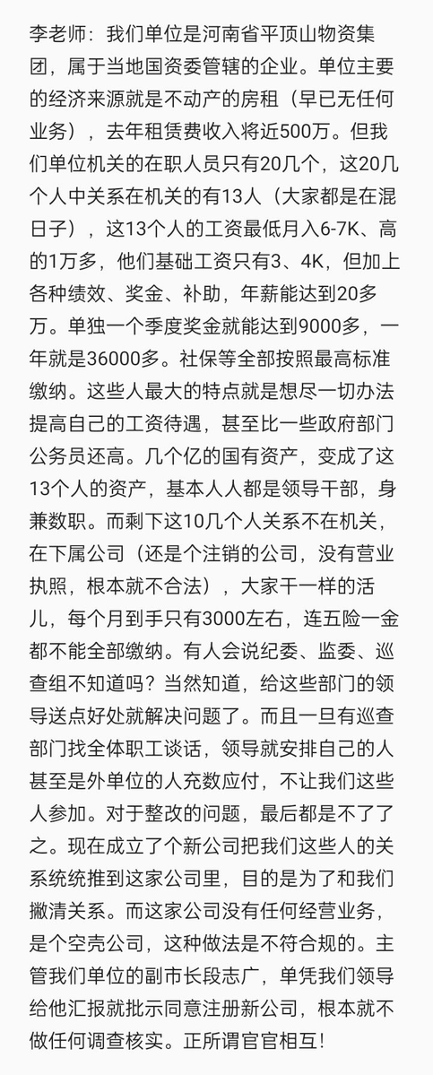 而剩下这10几个人关系不在机关,在下属公司(还是个注销的公司,没有营业执照,根本就不合法),大家干一样的活儿,每个月到手只有3000左右,连五险一金都不能全部缴纳。有人会说纪委、监委、巡查组不知道吗?当然知道,给这些部门的领导送点好处就解决问题了。