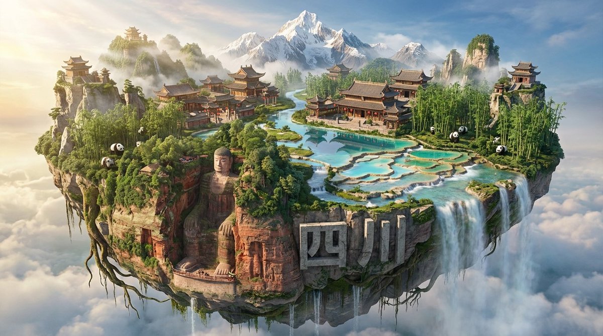 云海之上,一座“四川”化作漂浮仙境。雪峰环抱,古寺错落,竹林与梯田如翡翠铺展,清泉蜿蜒、瀑布倾泻。佛像静坐山崖,熊猫点缀其间,烟火与禅意并存。这里既有山河壮阔,也有人间温度,仿佛把千年巴蜀的灵魂,轻轻托在天空。#提示词 #ai #副业