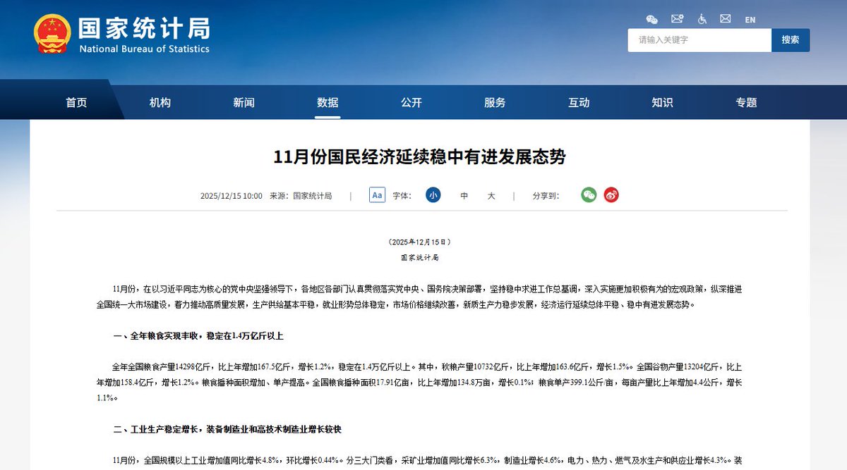 12月15日,国家统计局今日公布的数据显示,2025年11月份,全国城镇调查失业率为5.1%,与上月持平,就业形势总体稳定。本地户籍劳动力调查失业率为5.3%,外来户籍劳动力调查失业率为4.7%,其中外来农业户籍劳动力调查失业率为4.4%。