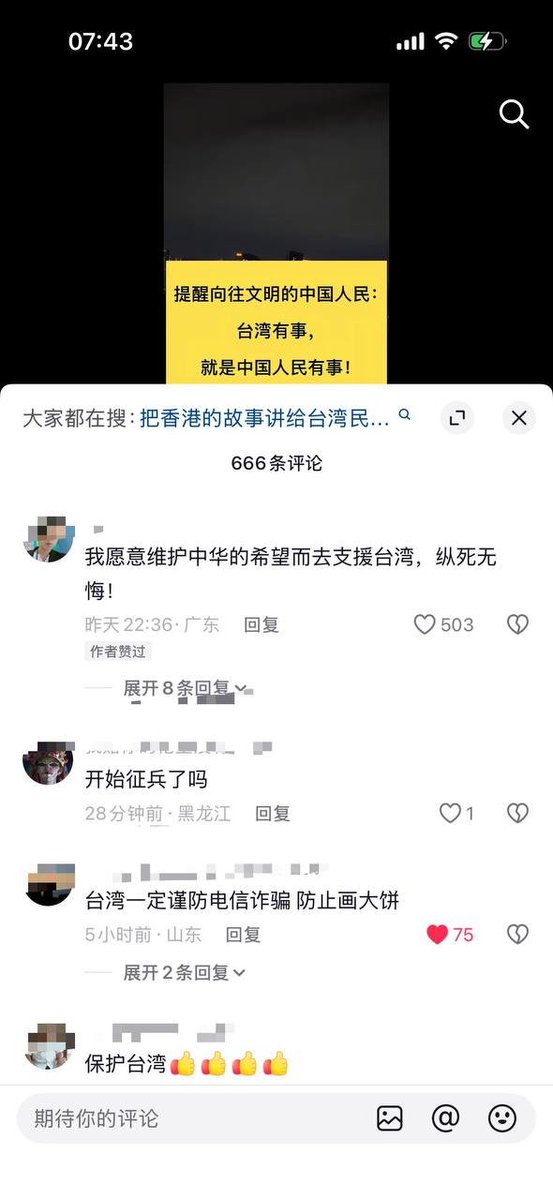 网友投稿:抖音有人提醒向往文明的中国民众:台湾有事,就是中国人民有事!评论区有网友留言:“敢动台湾同胞,必诛之”“永远和台湾人民站在一起,对抗真正的敌人”