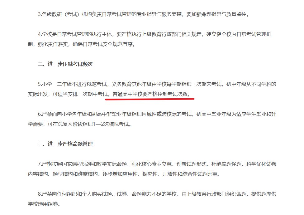 近日,教育部印发《关于进一步加强中小学日常考试管理的通知》,明确要求减少考试频次、提升考试质量、强化考试安全管理,切实减轻学生学业负担,促进学生身心健康发展。 提出,义务教育阶段其他年级原则上每学期只组织一次期末考试,初中可根据学科特点适当安排一次期中考试,普通高中须严格控制考试次数。同时,义务教育学校日常考试实行等级评价,成绩不排名、不公布,仅以适当方式反馈给学生和家长,坚决纠正“唯分数论”。