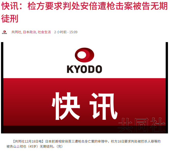 12月18日,据日本共同社报道,日本奈良地方法院就前首相安倍晋三遇刺案举行公开庭审。检方在庭审中提出量刑建议,要求法院对被控杀害安倍的被告山上彻也判处无期徒刑。