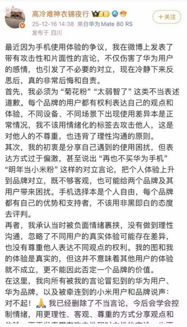 3个小时后,大V发布微博向华为道歉。