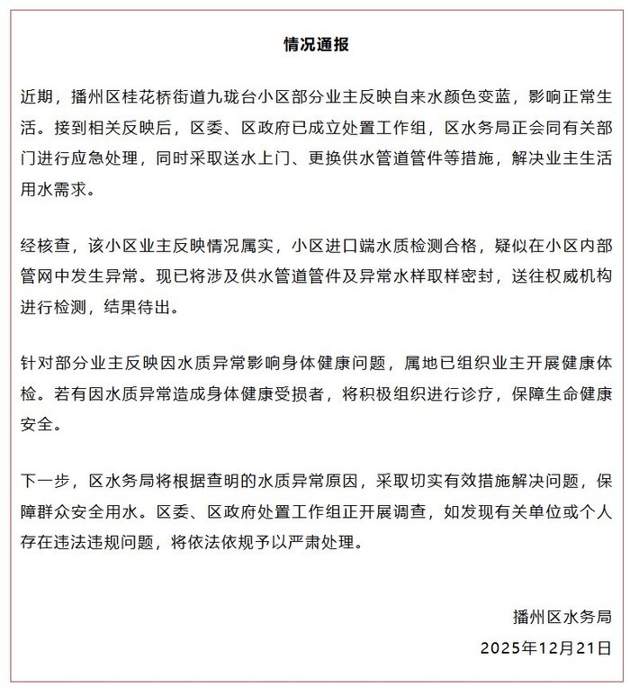 后续:12月21日,据播州区水务局通报,经核查,该小区业主反映情况属实,小区进口端水质检测合格,疑似在小区内部管网中发生异常。现已将涉及供水管道管件及异常水样取样密封,送往权威机构进行检测。