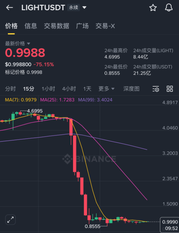 闪崩!LIGHT 五个半小时暴跌 77.7%,完成收割😨 24 小时交易额 21.3 亿美元,已成为币安 24H 合约交易量 TOP3 代币,仅次于 BTC 和 ETH,据 Coinglass 数据显示多空头累计被清算 484 万美元 OI 也从 4 点暴跌前的 5332 万美元缩减至当前的 1879 万美元(主要是币价暴跌导致),但合约持仓量不减反增,从 1197 万枚 $LIGHT 涨至 1879 万枚,大户多空比甚至是 1.63,看来游戏还要继续…