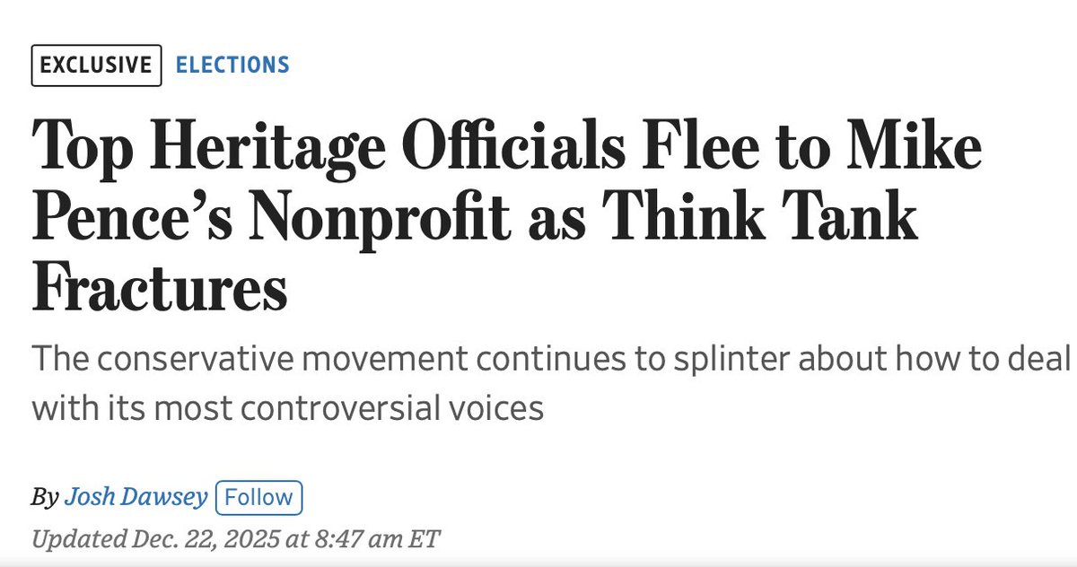 Personally, I think it's great news for Heritage that a bunch of Trump-hating RINOs are leaving. Anyone who would want to go work for Mike Pence's globalist never-Trump organization isn't MAGA and definitely doesn't put America First!