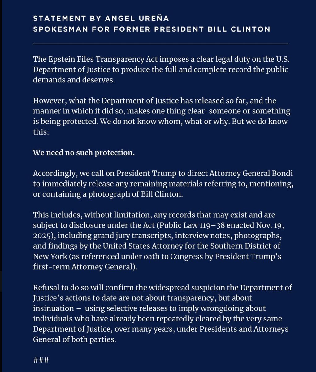 前总统比尔·克林顿的发言人刚刚发表声明,谴责川普当局,并呼吁全面公开爱泼斯坦案相关文件。声明表示,川普政府正在“选择性地披露信息,以暗示他人存在不当行为。”“有人或某种势力正在受到保护。”