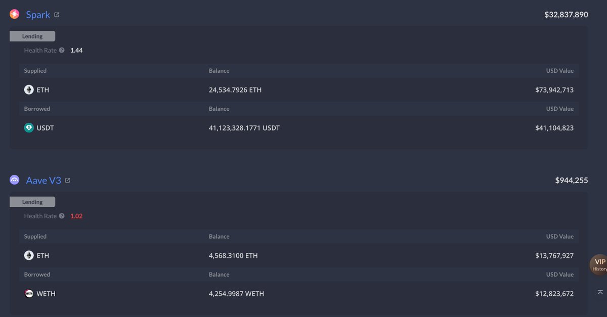 其中地址 0xce9…57c69 为主地址,共在 Spark 和 Aave 质押 29,103.1 ETH 并借出 4112 万枚 USDT